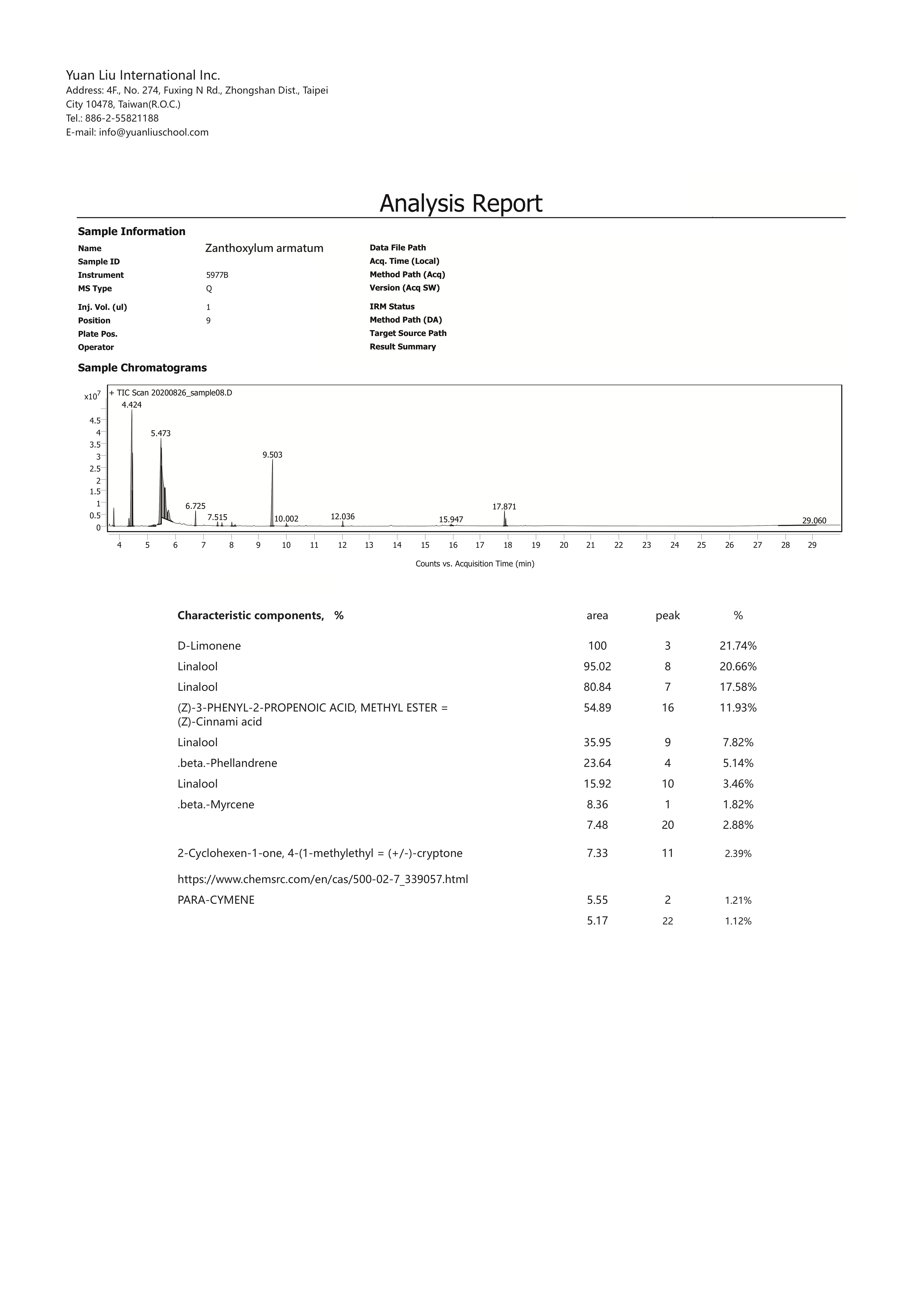 該精油的化學分子屬性以單萜醇(沉香醇50.04%)為大宗,再加上單萜烯29.1%(右旋檸檬烯21.74%、β-水芹烯5.14%、β-月桂烯1.82、對繖花烴1.21%),以及苯基酯(肉桂酸甲酯11.93%)等。